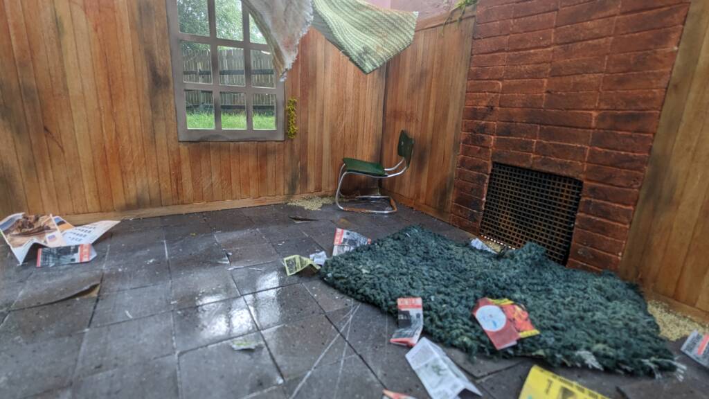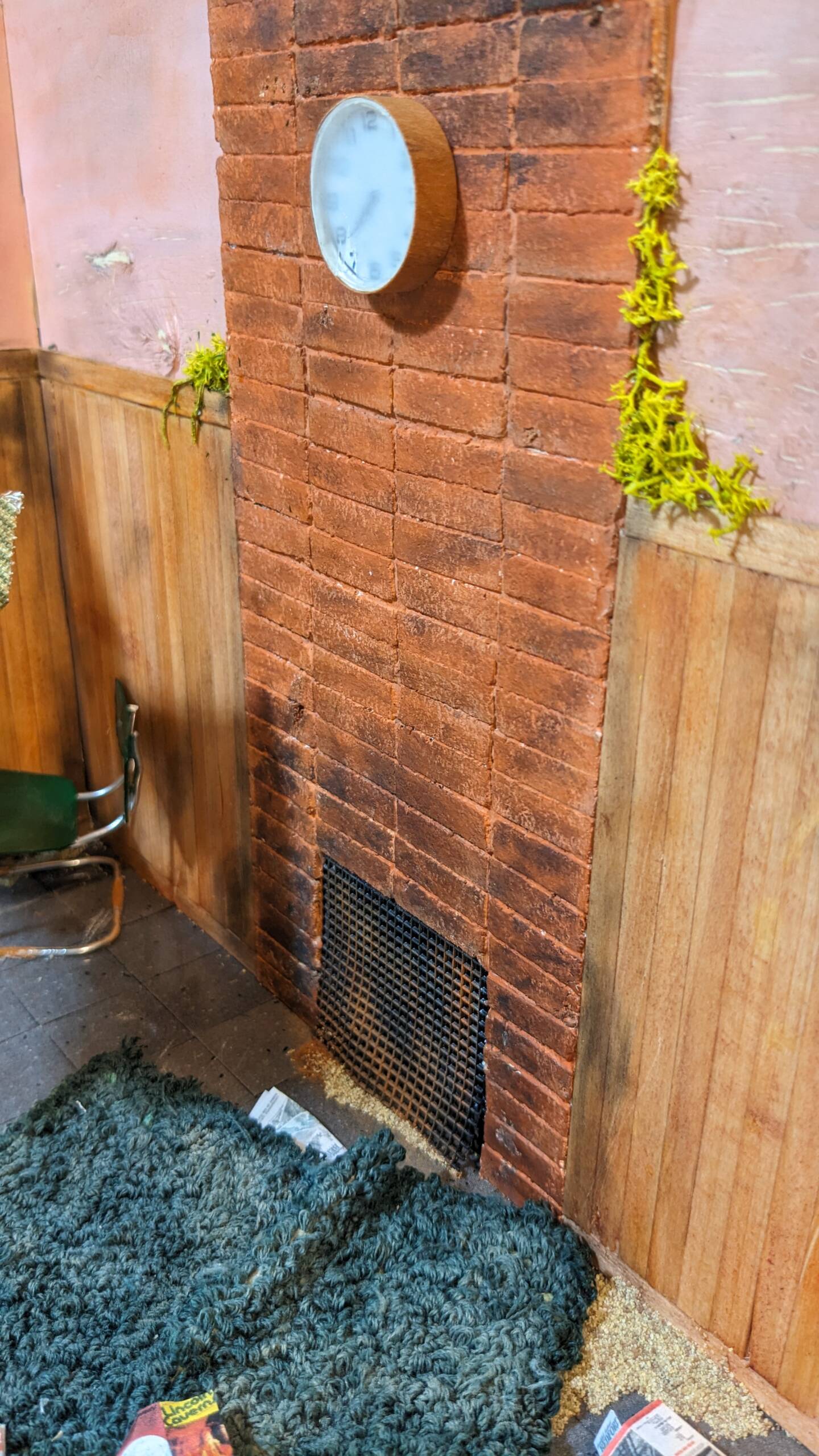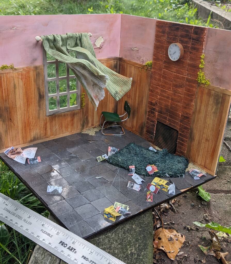 This “room box” diorama of an abandoned motel lobby was created as a project for an Atlas Obscura online course hosted by Amanda Kelly. Materials used include wood, fabric, cork, embroidery thread, paper, and a plastic bottle cap.