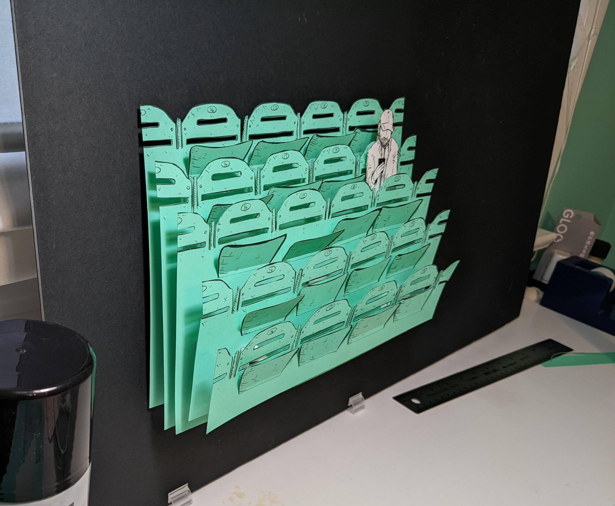 This illustration — a photographed paper model — was commissioned for Hobart Pulp’s annual baseball issue in 2022. It was created for Mike Prask’s short fiction piece “Cold-Weather Home Opener”.