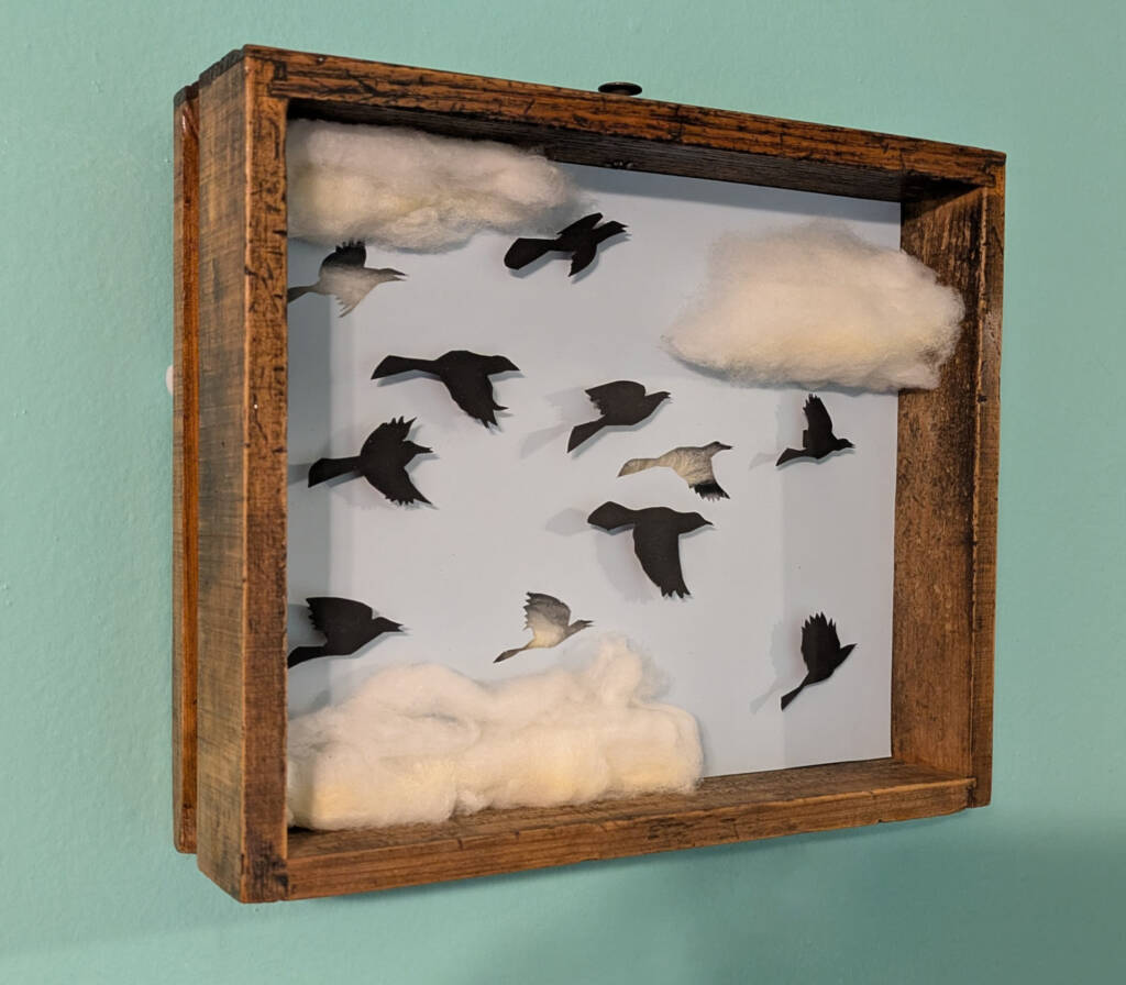 This multi-media diorama was created in 2026. Using a vintage drawer as the base, other materials used include paper, vinyl, cotton, and hairspray. It was included as part of the Whiskers to Wings show at the Peninsula Art Academy’s gallery in Peninsula, Ohio.